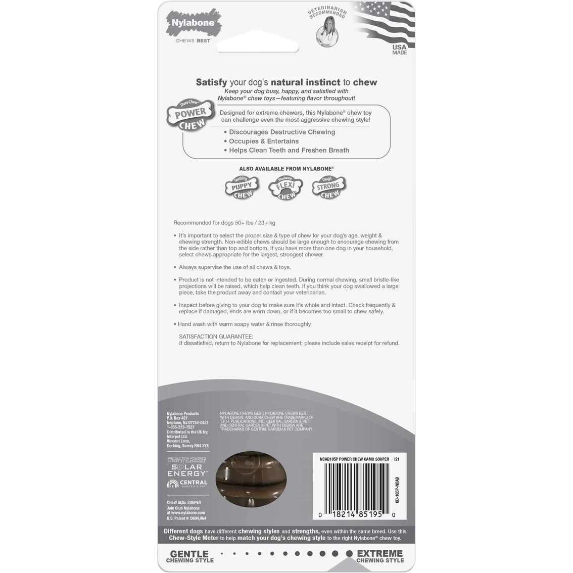 This special Nylabone Power Chew camo dog toy features a custom-made camouflage design and challenges extreme chewers. Made of Nylabone’s toughest material, the long-lasting chew toy provides ongoing enjoyment, satisfies the natural urge to chew, and encourages positive chewing habits. Plus, it is one of our most popular shapes, featuring ridges and nubs to help clean teeth and freshen breath as your dog chews. Reward your furry friend with this USA-made camouflage chew toy, available for a limited time only! Model: NCAB105P.