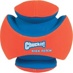 The Chuckit Kick Fetch ball features deep ridges which make it easier for your dog to retrieve. You kick, they fetch! Playtime with your dog is fun ground pursuit for them. Durable canvas, rubber and foam makes this big dog ball a favorite for outside games. Grooved design allows your dog to easily pick up and bring right back to you. Vibrant, high-visibility orange color makes this toy easy to track in large open spaces. Rubber content makes it bounce higher. Foam center makes it almost puncture resistant.