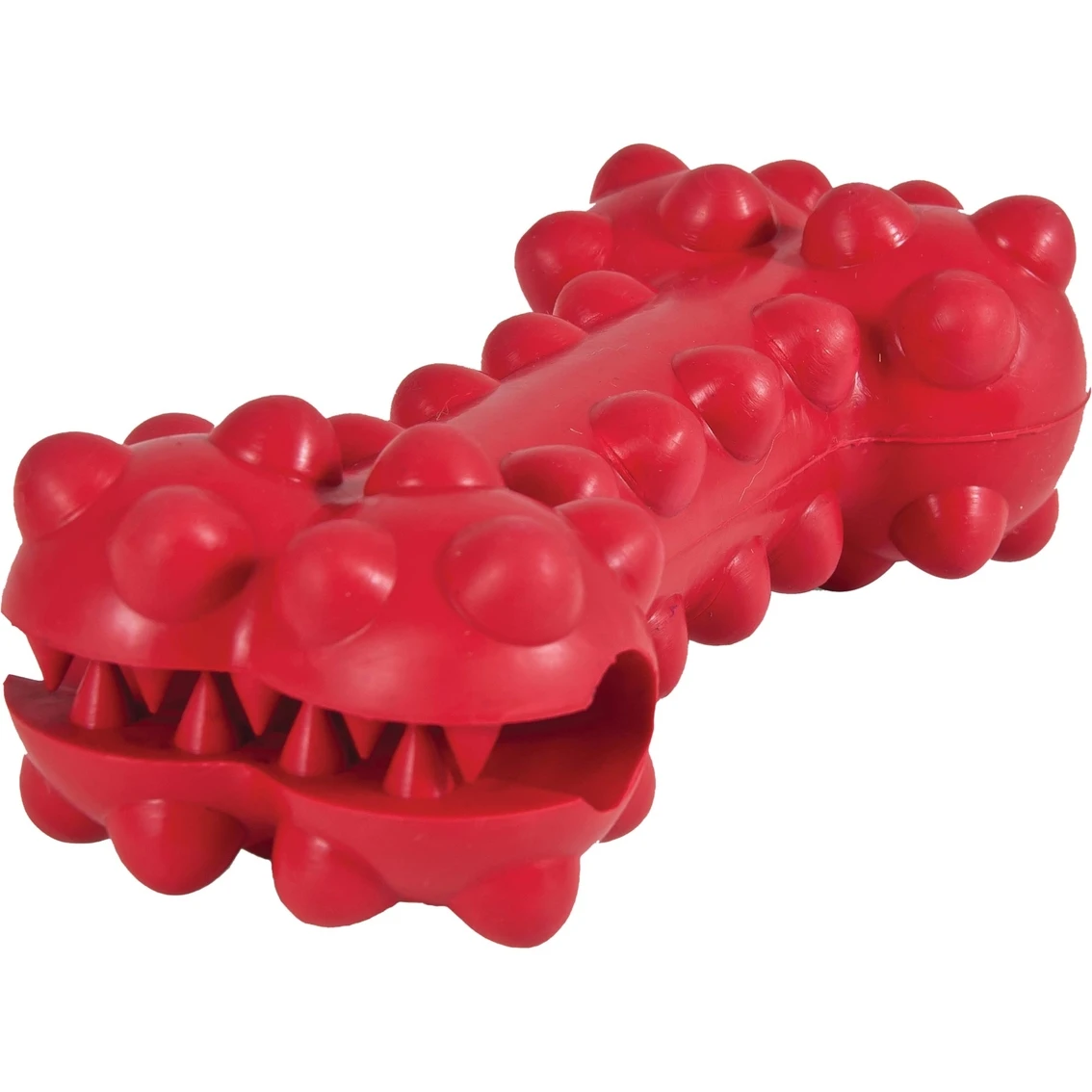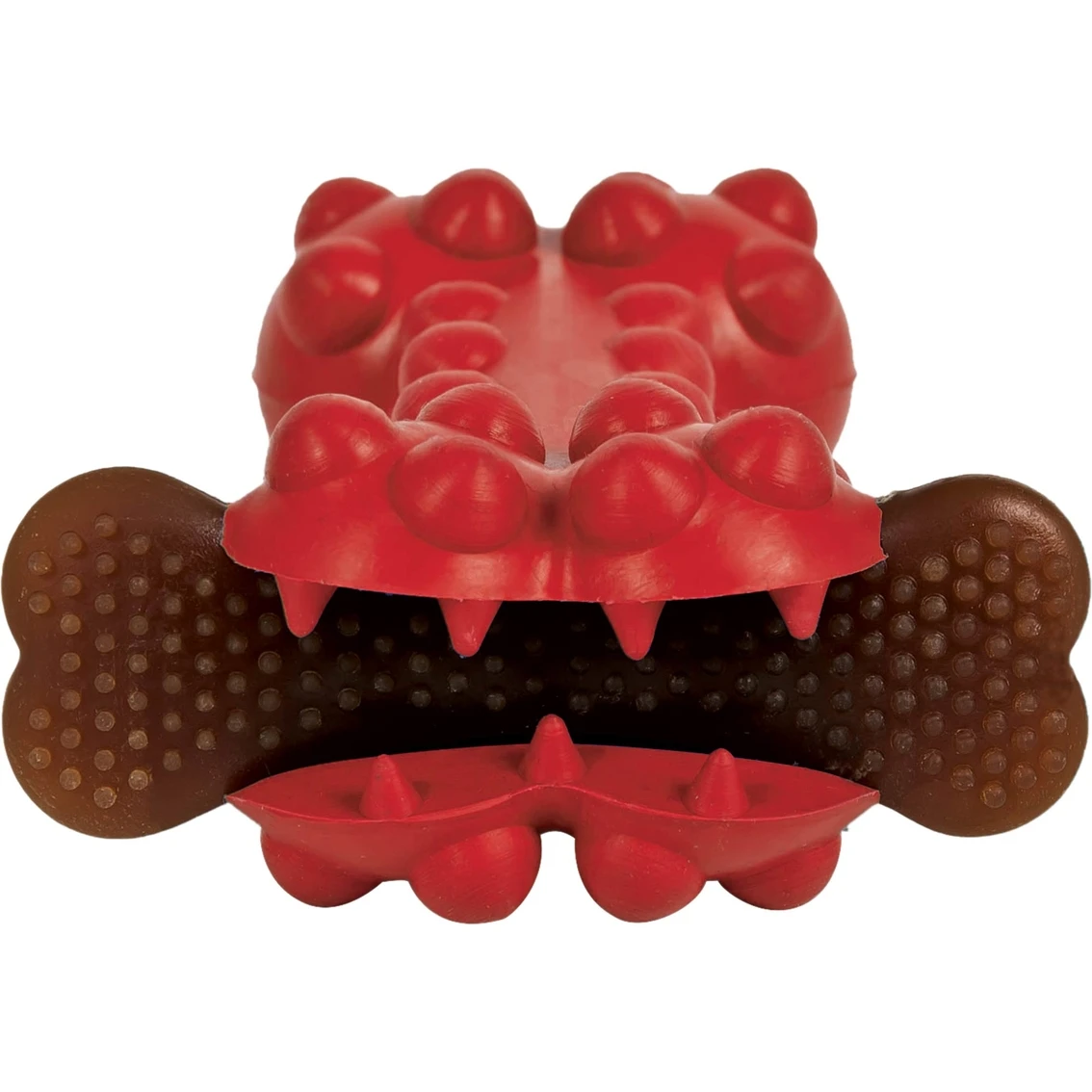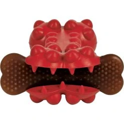 Classic bone shape. Tough rubber “teeth” grab dog treats, which helps make dogs’ treats last longer. Durable rubber infused with chicken-flavored protein for added dog interest. Knobby texture stimulates gums and promote dental health. Size: Medium. Model: 30813.